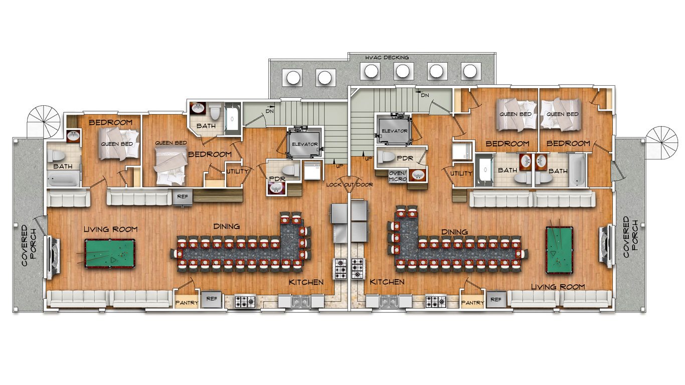225 20th Ave A and B offers 22 bedrooms, 21 bathrooms and 2 half baths that includes a master suite with see through decorative fireplace and Chroma-therapy heated tub. This property will accommodate 56 guests.